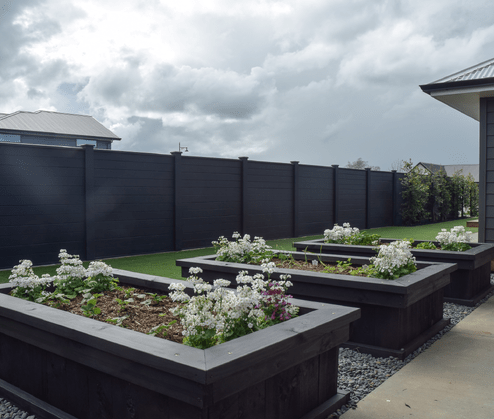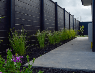 Around the back we have set up three black planter boxes for veges and flowers, what will end up as the 'hardest' part of the garden to maintain, as well as an astroturf back lawn. Down the side of the house we have planted some vibrant Lomandra grasses against stained black mulch and a jet black fence to really highlight its light green colour.