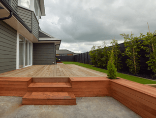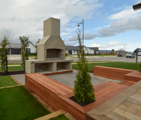 "We want a low maintenance and functional garden” is normally our brief when meeting new clients. Tasked with fully landscaping this show home for Davies Homes, we designed a main feature garden with a concrete fire place, redwood edging and kwila seating, a concrete pad and pine decking. Surrounding the fire place are lovely Lilly Pillies to provide privacy and slow growing Conifers that will require minimal attention.