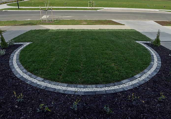 Around the front of the house we've continued using black mulch and Conifers in the garden along with some fragrant Star Jasmine, edged in a semi circle with pavers and gleaming Awarua White Stone. For the front lawn we've rolled some instant lawn from Fine Lawn to ensure a weed free, soft and vibrant lawn, and the only section of the property that will require mowing.