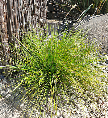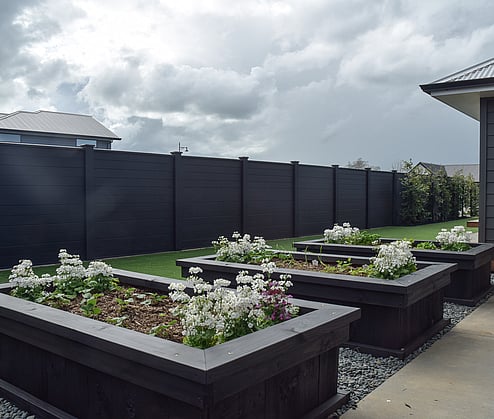 Around the back we have set up three black planter boxes for veges and flowers, what will end up as the 'hardest' part of the garden to maintain, as well as an astroturf back lawn. Down the side of the house we have planted some vibrant Lomandra grasses against stained black mulch and a jet black fence to really highlight its light green colour.